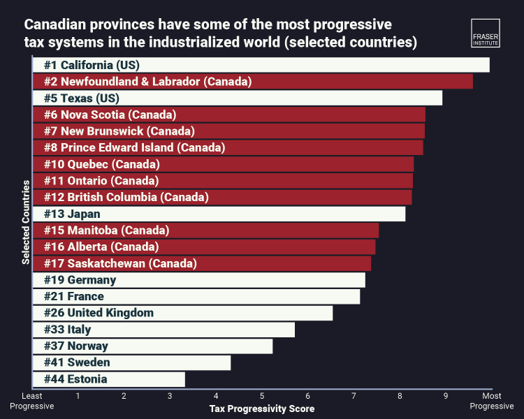 Newfoundland and Labrador maintains the most progressive tax system in Canada and the second-most progressive system out of the 45 jurisdictions measured. Saskatchewan's tax system is the least progressive in Canada, yet it still ranks 17thhighest overall. In other words, all Canadian provinces rank in the top half of OECD jurisdictions for tax progressivity.