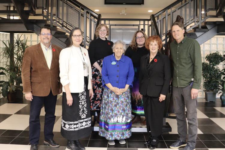 SUMA CEO Jean-Marc Nadeau, Treaty Commissioner Dr. Kathy Walker, SUMA Manager of Communications Roxanne Korpan, Elder Julie Pitzel, OTC Director of Public Policy and Development Darrelyne Bickel, SUMA President Randy Goulden, and OTC Treaty Relations Lead Charlie Clark.