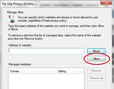 In the text box, enter municipalinfonet.com and then click on Allow. Close the box.
